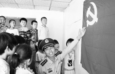 暑期之际,山东省潍坊大学生志愿者和边防支队官兵联合开展了“关爱留守儿童、共度暑假”活动,义务为孩子们辅导功课,让孩子们安全、快乐的度过暑假。图为8月2日志愿者正在向留守儿童讲解党旗有关知识。(本报记者 刘新武摄)