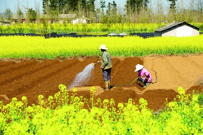 云南省罗平县腊山街道大水塘村的农民在田间浇水整地。