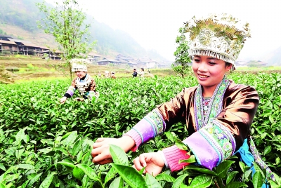 在广西柳州市融水苗族自治县安太乡江竹苗寨,苗家女石春雪(前)在采摘春茶。