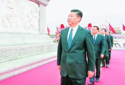 习近平迈步上前,整理花篮缎带。接着,习近平等党和国家领导人缓步绕行,瞻仰人民英雄纪念碑。