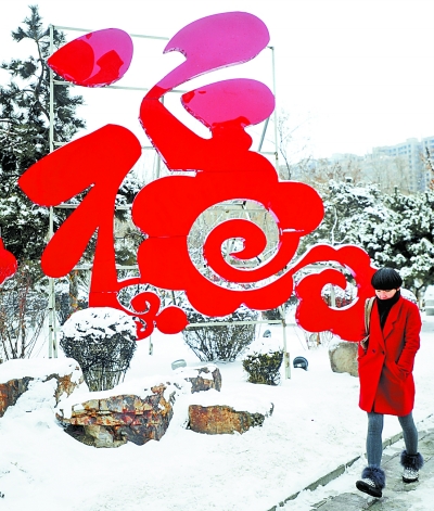一名行人从沈阳街头的大型“福”字旁走过。新华社发