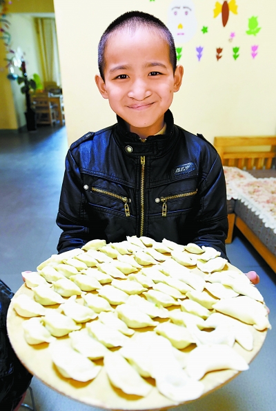 郑州市儿童福利院孩子董阳阳端着刚刚包好的饺子。 新华社发