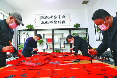 日前,中国铁路太原局集团有限公司侯马北车辆段举办了“迎万福送万家”春联书法公益活动。活动邀请段内职工书法爱好者挥毫泼墨,为大家送去新春的问候与祝福。图为该单位计量室职工写春联。王建钢摄/光明图片