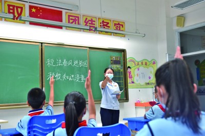 近日,内蒙古巴彦淖尔市甘其毛都口岸税务局税务干部走进辖区学校,通过寓教于乐的活动,为学生带来一堂别开生面的税法宣讲课。图为税务干部在课堂上与学生互动。张权摄/光明图片