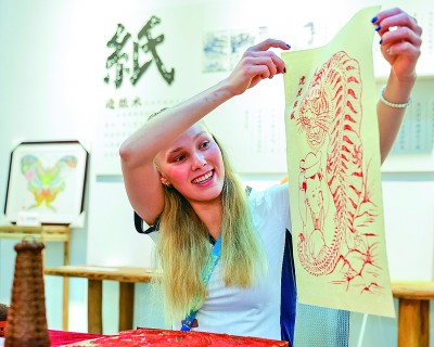 芬兰运动员展示自己制作的夹江年画。新华社发