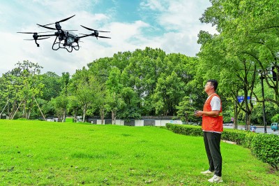 近日,浙江省绍兴市越城区园林中心引进推广无人机喷洒农药作业,解决了无法将药物喷洒至较高植物顶端的难题,用科技力量推动绿化养护水平不断提升。图为8月4日,越城区园林中心工作人员在实施无人机喷洒农药作业。
