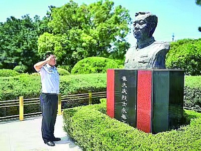 崔申迪在崔大庆烈士纪念雕塑前敬礼。资料照片