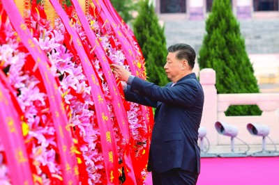 习近平迈步上前,仔细整理花篮缎带。随后,习近平等党和国家领导人缓步绕行,瞻仰人民英雄纪念碑。