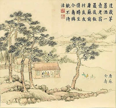 屠苏这个名词更为常见的义项是指建筑物。屠苏是一种平顶草屋,东汉服虔《通俗文》称:“屋平曰屠苏。”《宋书》记载北魏太武帝拓跋焘所住屠苏曾被雷击倒,唐代段成式的《酉阳杂俎》记载一位禅师居住于寺内屠苏中,可见屠苏是汉魏隋唐时期的常见建筑,上至天子、下至平民皆可居住。比如王安石《元日》诗中为人熟知的那句“春风送暖入屠苏”,亦被许多论者认为,是在描写茅屋中的春节景象。