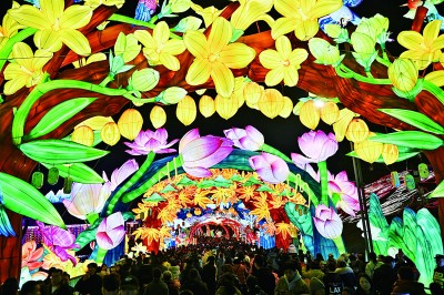 1月15日,第31届自贡国际恐龙灯会在四川省自贡市中华彩灯大世界亮灯试展。本届灯会以“灯贺中华 气象万千”为主题,打造“迎春贺年”“华彩神州”“欢乐盛典”等7大主题区。图为当晚,游客在自贡灯会上游览。新华社发