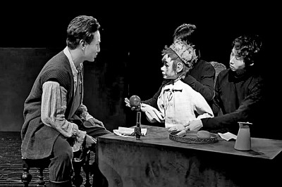 传统观念通常认为,只能看见偶的戏才是“偶戏”,偶戏表演要将操纵偶人的演员完全遮挡起来。而如今,时而人、时而偶,或是人与偶同台成为偶剧表演的主要形式。并且,人与偶同台表演使舞台表现更加生动,受到观众和创作者的青睐。如偶剧《伽利略传》就采用了人与偶同台表演的方式,对偶剧表演中,偶的运用尺度,偶在某些角色和场景中取代真人演员的必要性和原则等进行了探索。在木偶剧《铁道小飞虎》中,同是对“强子”这一角色的展现,既有一比一“人偶同体”的方式起到刻画人物的作用,也有较小的扬州杖头木偶方式,在舞台远景中表现群体形象和肢体动作,使舞台富于变化。