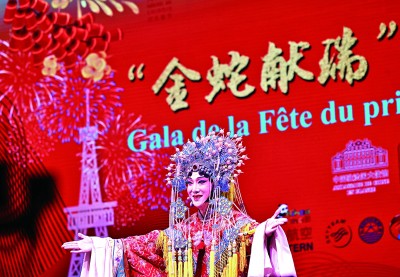 由巴黎中国文化中心、欧洲卫视主办的“金蛇献瑞”巴黎春节联欢晚会1月20日晚在巴黎莫加多剧院上演。图为20日,在法国巴黎举行的“金蛇献瑞”巴黎春节联欢晚会上,董飞表演京剧《梨花颂》。新华社发