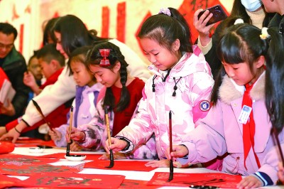 1月24日,“我们的节日·春节”主题活动在山东青岛即墨古城举办,即墨区的孩子们欢聚一堂参加写福送福、非遗体验、手工制作等丰富多彩的活动,在喜庆祥和的氛围中迎接新春佳节的到来。图为小朋友们在主题活动中写福字。梁孝鹏摄/光明图片