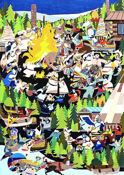 传统中国画讲求通过留白等手段凸显虚实相生的章法,农民画同样重虚实。在人们的印象中,农民画的一大共性是画面元素满密,创作者希望画纸如土地一般物尽其用,但他们在饱满的构图中也十分注重留白空间的营造。李苏兰的《盛世欢歌庆丰年》聚焦“济阳鼓子秧歌”,通过舞龙、舞狮、舞伞、击鼓等民俗内容,生动展现出农民欢庆春节的热烈场面。画面中,左方的秧歌队伍与右上方的建筑群皆呈现出满密的视觉效果,创作者巧妙地在两者之间营造出留白空间,使人群与建筑群仅在局部相连,在有效分割画面的同时,增添了丰富的层次感。同样是追求层次感的营造,王莉、吕金昱合作的《正月正》则是以实为虚,用“实”和“更实”彰显虚实对比。该作品描绘了夜色下东北农村欢度除夕的景象,踩高跷、划旱船、放鞭炮等活动让人眼花缭乱,而那些顶着白雪、呈环形排布的树则成为画面中的“气口”。雪树虽为实物,但在与周遭景象的繁简对比之下,变为一个个局部场景中的留白空间。