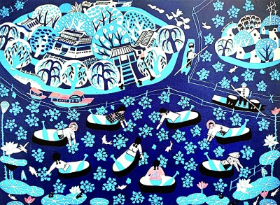 改革开放以来,农民画家的创作更加聚焦农民日常生活,并强调对画面情感氛围的烘托。如张觉民的《南湖菱歌》表现了农民在嘉兴南湖中采菱的场面。人物、景物的塑造方式极具装饰性,花木盛放的村落、水面铺满的南湖菱,以及一张张洋溢笑容的脸庞,诗意地表现出农民生活的富足与喜乐。与新中国成立之初的农民画相较,这一时期的创作因更多情感温度的注入,有效消弭了以往宣传式农民画所带来的距离感,使观者更加真切地感受到农民的幸福生活,进而产生情感共鸣。
