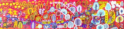 斑斓色彩的运用,体现出农民画家对生活的热爱,是创作者内心世界的写照。因此,农民画的色彩往往是非写实的,这种非写实在一定程度上归因于色彩的高明度和高饱和度。以刘丽的《满山是宝》为例,该作品描绘了山野间的丰收景象,在描绘果树时,画家用到了几乎未经调配的大红色、明黄色等。以这样的设色方式塑造的景物虽与现实相悖,却能将观者引入另一个世界,让人们仿佛回到孩童时期随心所欲的涂鸦状态,激起人类原初对自然的赞美之情,并从中获得审美享受。当然,除了改变景物色彩的明度和饱和度外,甚至还可以背离物象的固有色系,完全主观地表达画家心中的色彩天地,如柯亦斌的《年年有鱼 惠见未来》中橘色的海洋,以及魏邵康的《歌舞升平颂丰收》中的粉色树林等。