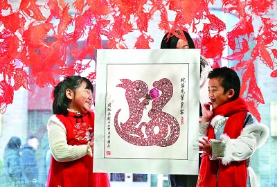 春节将至,河北石家庄各地人们纷纷忙着购年货、逛集市,在多种喜庆的活动中迎接新春佳节。图为1月27日,小朋友在石家庄市新华区迎新春主题活动中欣赏剪纸作品。陈其保摄/光明图片