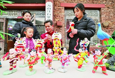 1月30日,在山东省临沂市沂南县红石寨景区举办的新春庙会上,游客在观看手工艺人现场制作非遗面塑。新华社发