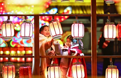 春节期间,各地开展丰富多彩的夜游活动,游客们赏花灯、看民俗、逛古城,在夜景中热闹过年。图为1月31日晚,在山东省临沂市郯城县郯国古城景区,两名小女孩在观赏花灯。新华社发