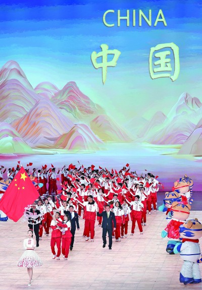 当中国代表团入场时,体育健儿挥手致意,现场观众起立鼓掌。在本届亚冬会上,中国代表团将参加全部项目的比赛,并朝着“取得我国亚冬会参赛史上最好成绩”的目标全力进发。