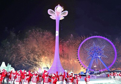 在《冰雪的亚细亚》的欢快乐曲声中,来自34个国家和地区的体育代表团相继入场,受到全场观众的热情欢迎。哈尔滨,这座“冰雪之城”,用热情撰写了一部热气腾腾的迎宾志。