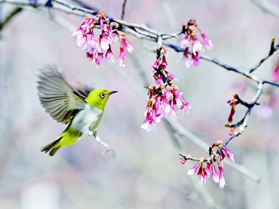 2月9日,“福建省2025年相约春天赏樱花十大打卡点发布会”在宁德市霞浦县玉潭樱花谷生态科技园举行。福建省樱花协会发布的十大樱花打卡点涵盖宁德、三明、福州、厦门、龙岩、南平等地的知名樱花景区,这些打卡点各具特色,既有历史悠久的老牌赏樱胜地,也有新兴的樱花主题休闲区,为游客们提供了丰富的春日赏樱选择。图为绣眼鸟在霞浦县玉潭樱花谷生态科技园觅食樱花蜜。新华社记者 姜克红摄