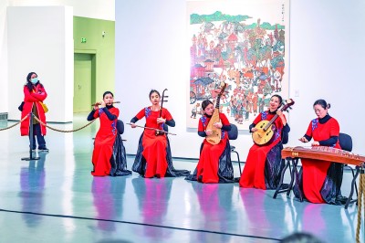 2月9日,在江苏省苏州市姑苏区,一场以“江南春景”为主题的国风音乐会在苏州美术馆奏响。音乐会自“江南”入题,以“春日”收尾,市民观众在弦音画作的融合中遍游江南春景。图为观众在苏州美术馆观看国风音乐会的演出。张锋摄/光明图片