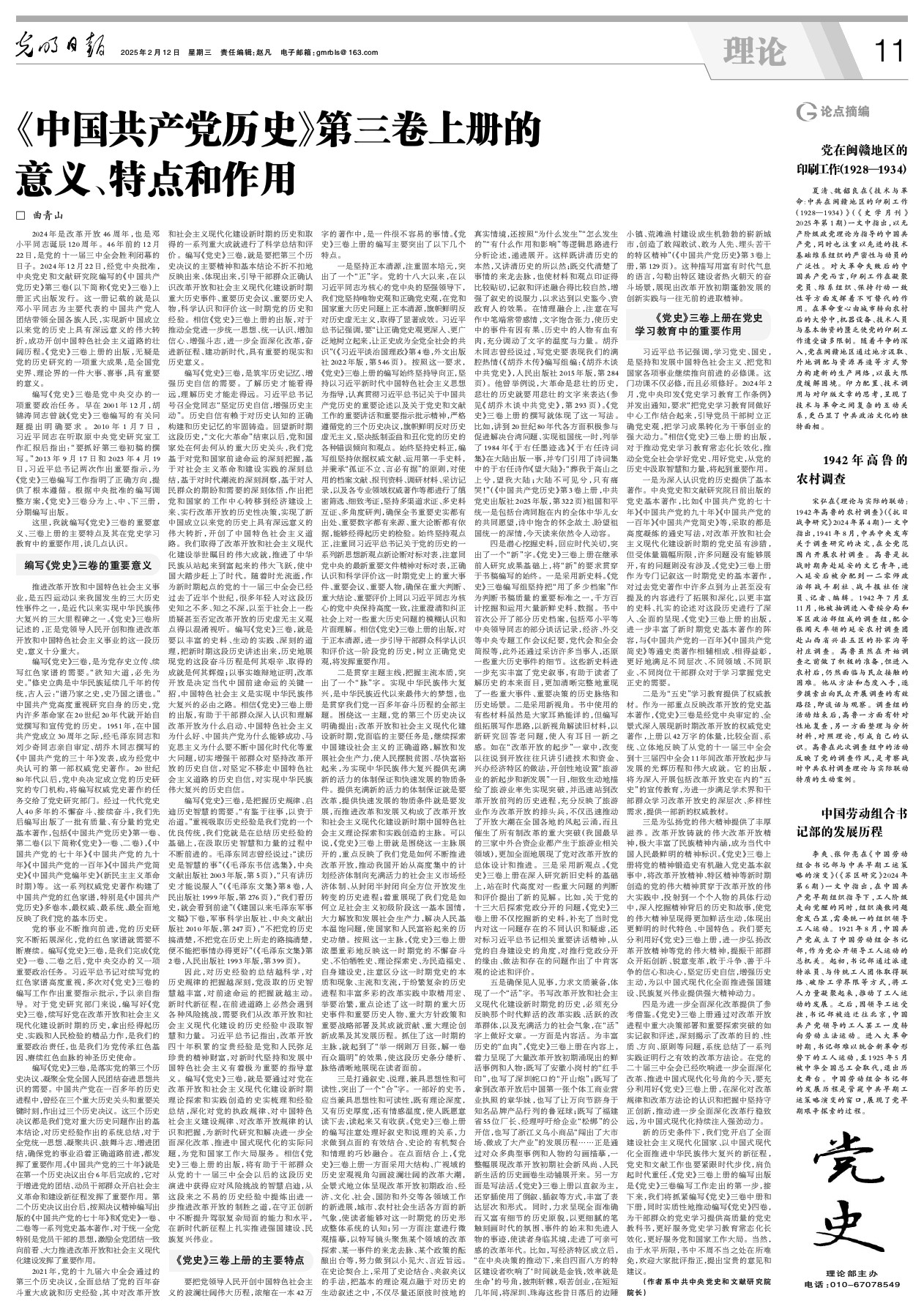 这里,我就编写《党史》三卷的重要意义、三卷上册的主要特点及其在党史学习教育中的重要作用,谈几点认识。