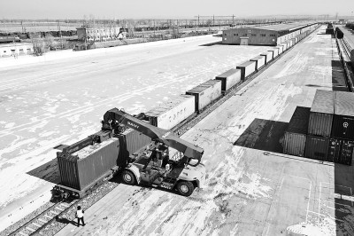 新春伊始,在内蒙古呼和浩特市中欧班列集结中心——沙良物流园内,工作人员忙碌地开展中欧班列集装箱装运工作。今年以来,为有效保障中欧班列运输通畅,中国铁路呼和浩特局集团有限公司呼和浩特铁路物流中心提前调配装卸机具和人员,对中欧班列采取优先装卸、优先配车、优先发运等措施,助力中欧班列安全高效开行。图为2月10日,工作人员驾驶正面吊在沙良物流园内装运中欧班列集装箱。新华社记者 李志鹏摄
