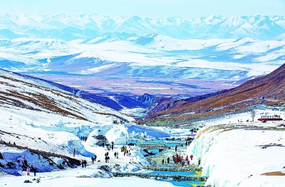 位于青海省门源回族自治县青石嘴镇境内的七彩瀑布,坐落在祁连山岗什卡雪峰山腰间。因岗什卡雪峰山体由偏酸性石英角闪岩、基性火山岩等组成,雪水溶解各种矿物后在源头形成独特的多彩瀑布群,冬日结冰后,绚丽壮观。图为2月16日,游客在七彩冰瀑游览。杨永伟摄/光明图片