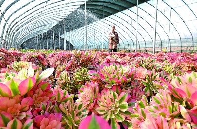 2月17日,河北省邯郸市峰峰矿区彭城镇河泉村的农民在给多肉植物浇水。郝群英摄/光明图片