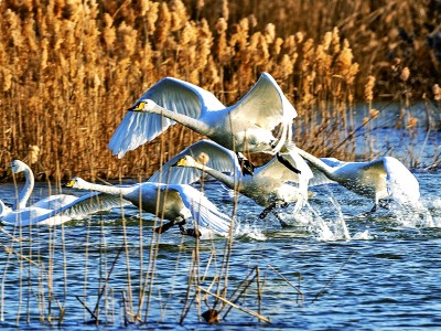 “天鹅的最佳观赏时间就是清晨和黄昏,此时它们优美的身姿与山光水色融为一体,极具观赏性。”摄影爱好者、白天鹅保护志愿者武跃峰说。每逢日出、日落时,湖面在霞光的映照下金光灿灿,白天鹅或成群结队展翅翱翔,或徜徉水中嬉戏玩耍,或低头觅食悠闲惬意……