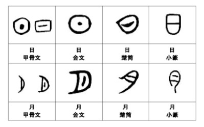 甲骨文“日”作一圆圈,像太阳的轮廓,又或在圆圈中加一黑点。圆形在甲骨上刻画多有不便,因而“日”的外框由圆转方。圆圈中的黑点也逐渐写成短横。甲骨文“月”作月牙形,像一弯新月。在早期甲骨卜辞里,“月”和“夕”(傍晚月出的时候)的字形没有区别。后来在月牙中加一竖笔表示“夕”。殷商末期才逐渐固定使用月牙中加一竖笔的为“月”,月牙中不加竖笔的为“夕”。综合出土的陶纹、岩画图像和甲骨卜辞来看,许慎在《说文解字叙》中将“日”“月”作为采用“画成其物,随体诘诎”的“象形”方式构造的代表汉字是很恰当的。小篆以后,“日”“月”的基本字形几千年来稳固不变。