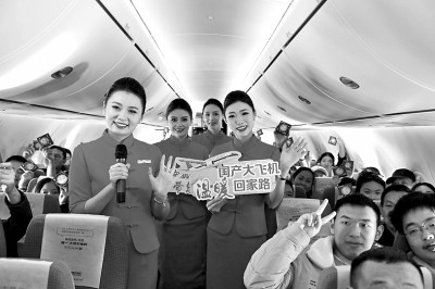 1月14日,春运第一天,在南航CZ8233广州—成都天府航班上,空乘人员开展C919国产大飞机投入春运主题活动。新华社记者 王瑞平摄
