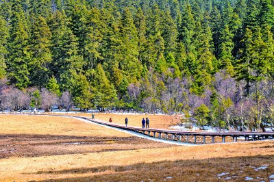 初春时节,云南省迪庆藏族自治州普达措景区景色宜人,高山草甸、原始森林、湖泊湿地构成了一幅美丽的生态画卷,吸引不少游客前来观光。图为2月23日,游客在普达措景区游览。新华社发