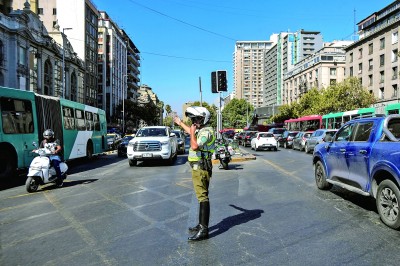 在智利首都圣地亚哥,一名警察在停电期间指挥交通。新华社发