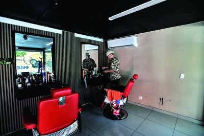 在智利首都圣地亚哥,一名理发师在停电的理发店内整理工具。新华社发