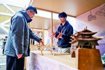 2月25日,中国木拱桥传统营造技艺传承发展交流活动在浙江省温州市泰顺县举行。本次活动设置了新建廊桥圆桥仪式、中国木拱桥传统营造技艺实践成果展、廊桥市集、“对话廊桥”沙龙等多项活动,来自浙江、福建两省的多位木拱桥传统营造技艺传承人参与其中。图为在泰顺文化中心,工作人员(右)介绍中国木拱桥传统营造技艺的基本原理。新华社记者 江汉摄
