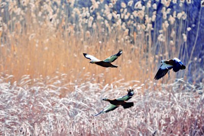 随着天气逐渐转暖,黄河宁夏段迎来众多候鸟驻足。近年来,宁夏全力推动黄河流域生态保护和高质量发展先行区建设,黄河及两岸湿地的保护力度不断加大,生态环境持续向好,黄河两岸的滩涂、湿地已成为候鸟重要的补给站、栖息地。图为候鸟在黄河宁夏段一处湿地上空飞翔。新华社记者 王鹏摄