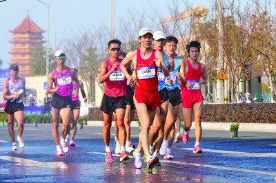 3月1日,2025年世界田联竞走巡回赛暨全国竞走大奖赛(第1站)暨东京世锦赛选拔赛(第1站)在江苏省太仓市举行。图为中国选手钱海峰(前一)在男子成年组20公里竞走比赛中,他以1小时17分58秒的成绩获得季军。新华社记者 李博摄