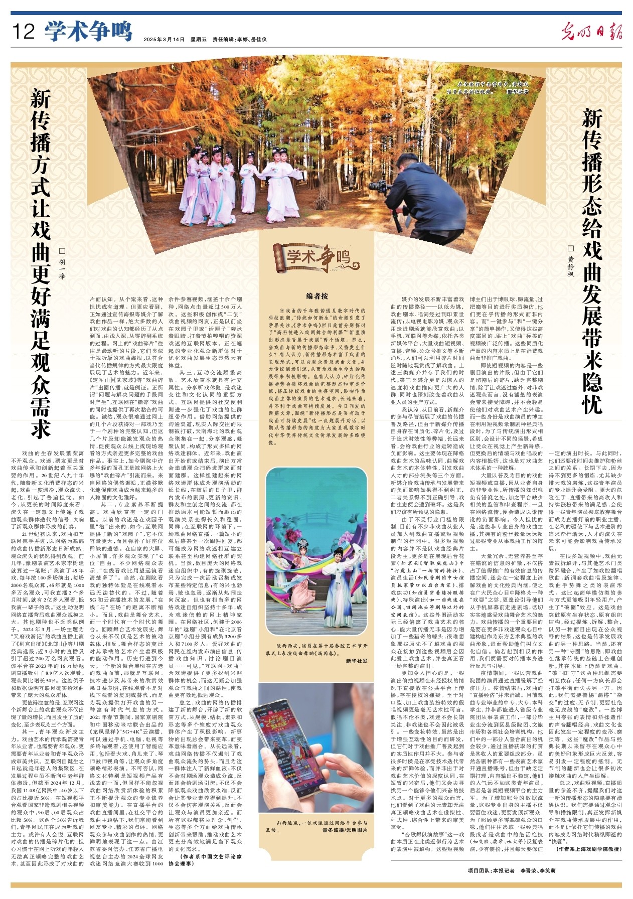 总之,戏曲短视频、直播质量的参差不齐,提醒我们对这一新的传播形态的隐患要有清醒认识。我们需要通过观念引导和措施限制,真正发挥新媒介在戏曲传承发展中的作用,而不是让依托它们传播的戏曲内容成为网络时代稍纵即逝的“快餐”。