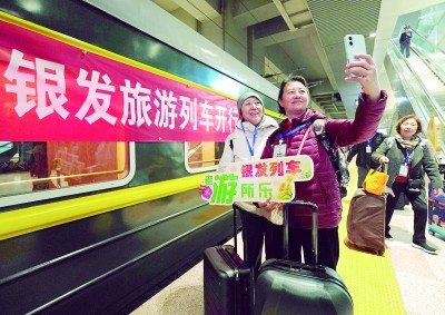 3月15日,2025年京津冀首趟银发旅游列车从天津站始发,沿途经停北京丰台站、河北霸州站、衡水站,共搭载452名京津冀地区银发族游客开启为期12天的跨区域文旅深度体验。新华社记者 张晨霖摄