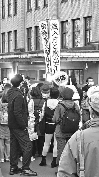 图为3月14日日本财务省外的抗议现场。 本报驻东京记者 高庆哲摄/光明图片
