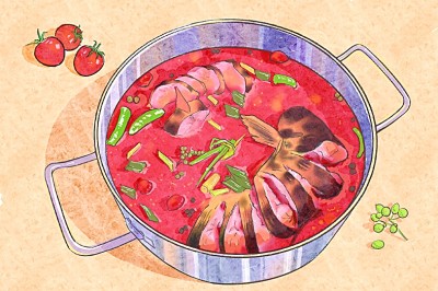 相传,很久以前有户苗族人家把煮饭的米汤倒进杉木桶里存着,过几日揭开盖子,没想到酸溜溜的香气直往鼻孔里钻。阿妈舀了一瓢,哎呀!酸得眉毛一抖!往野菜里一浇,硬是把苦味涩味都赶跑了。有了酸香还少不了稻香!苗家人世代传承稻鱼共作种养模式,把满身稻香的鱼儿放进毛辣果(贵州野生小西红柿)煨出的红色酸汤,苗岭的食材精华就都在这锅里了!自然的馈赠、祖先的智慧、食客的味蕾,尽在此刻相会,碰撞出令人销魂的“酸爽”。