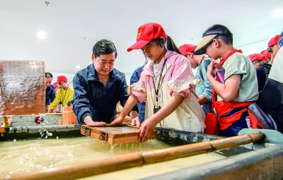 3月26日,安徽省芜湖市繁昌区繁阳镇的学生们走进宣纸之乡——泾县的宣纸文化园,深入了解宣纸悠久历史与复杂工艺,体验捞纸、晒纸等制作工序。邢朝明摄/光明图片