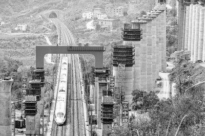 3月27日,在成达万高铁左线福寿跨渝万城际特大桥项目施工现场,成达万高铁首个跨既有高铁钢横梁吊装完成,也是三峡库区首次跨既有铁路线施工作业的成功案例,为后续桥梁架设奠定关键基础。成达万高铁建成后,将形成成都直达中原和京津冀地区的便捷客运通道,极大便利沿线人民群众出行,促进沿线经济社会发展,对助力成渝地区双城经济圈建设、长江经济带等国家战略实施,具有重要意义。图为郑渝高铁线上一列动车从门式墩钢横梁下通过。