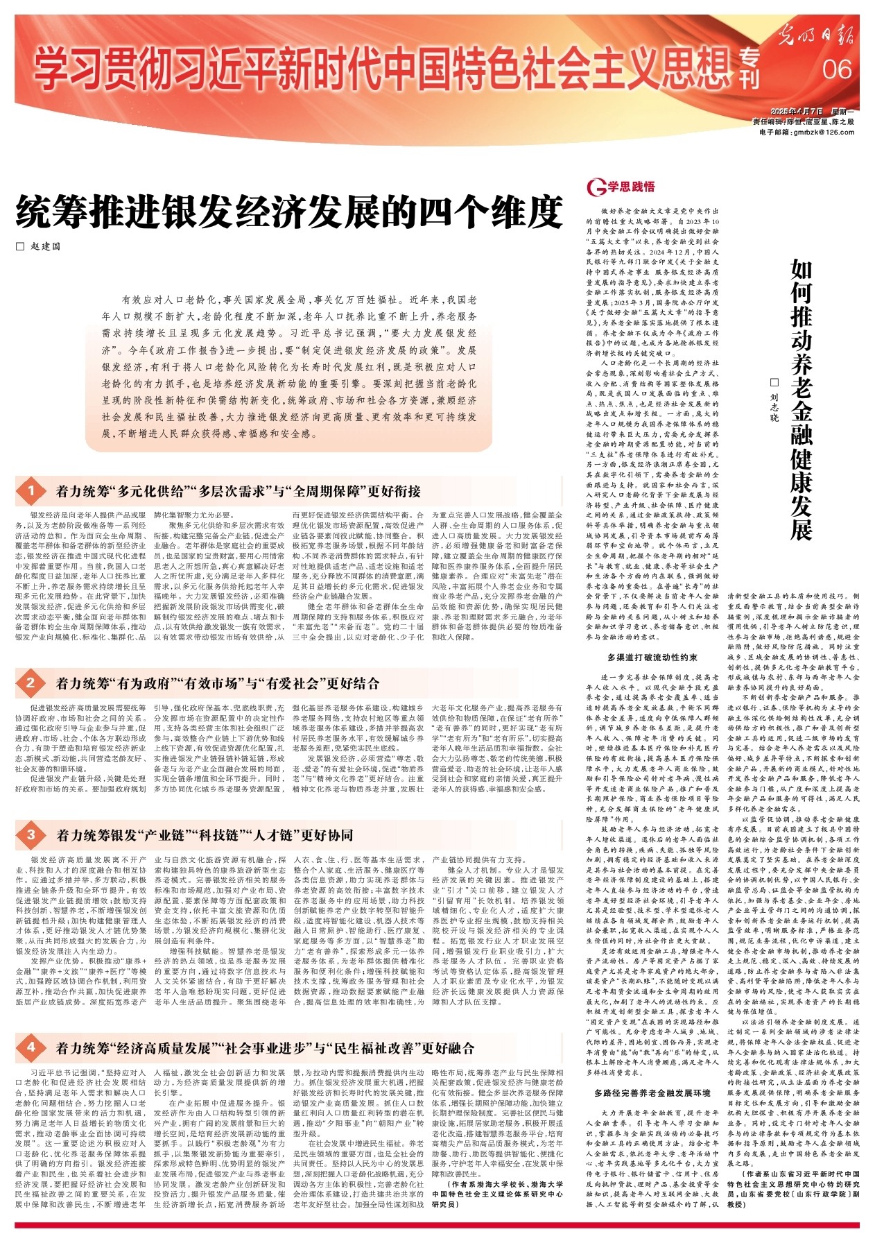 习近平总书记强调,“坚持应对人口老龄化和促进经济社会发展相结合,坚持满足老年人需求和解决人口老龄化问题相结合,努力挖掘人口老龄化给国家发展带来的活力和机遇,努力满足老年人日益增长的物质文化需求,推动老龄事业全面协调可持续发展”。这一重要论述为积极应对人口老龄化、优化养老服务保障体系提供了明确的方向指引。银发经济连接着产业和民生,也关系着社会进步和经济发展,要把握好经济社会发展和民生福祉改善之间的重要关系,在发展中保障和改善民生,不断增进老年人福祉,激发全社会创新活力和发展动力,为经济高质量发展提供新的增长引擎。