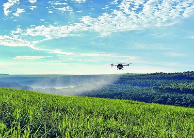 中国的无人机被大量引入非洲国家,助力当地农业现代化进程。图为3月25日,在南非夸祖鲁-纳塔尔省的方廷希尔庄园,中国农用无人机为甘蔗林喷洒杀菌剂。新华社发