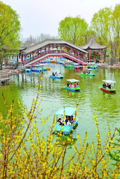 4月6日,游客在位于甘肃省兰州市安宁区的仁寿山公园内泛舟赏景。新华社发