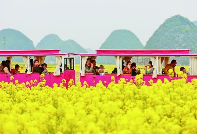 4月6日,在贵州省安顺市平坝区白云镇平元村,游客乘坐观光小火车在油菜花海中赏花游览。新华社发